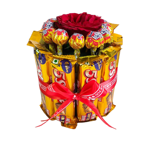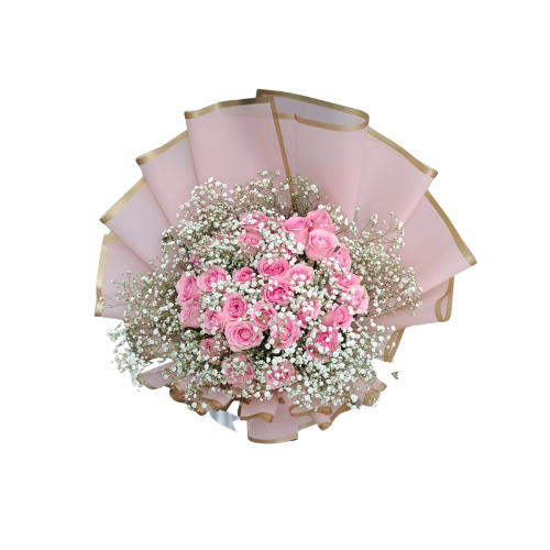 This staples combination consists of more than ten gorgeous red roses which make it clear that this is the bouquet of deep love. They are subtly filled with white flowers that look delicate and surrounded with clean white paper accentuated by gold, i.e. giving it the classic appearance.